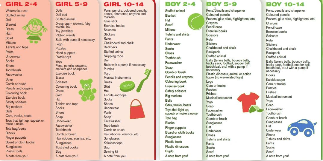 (1). You can fill a Red drawstring backpack yourself and label it with gender and age group that it is for.